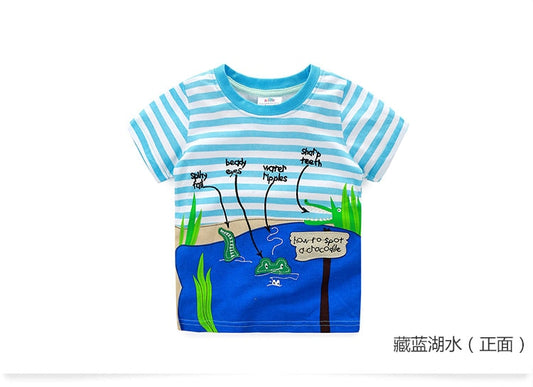 2023 Summer 2-10T Children's Birthday Clothing Dinosaur Car Striped Print Short Sleeve Basic Tops Cartoon T-Shirt For Kids Boy