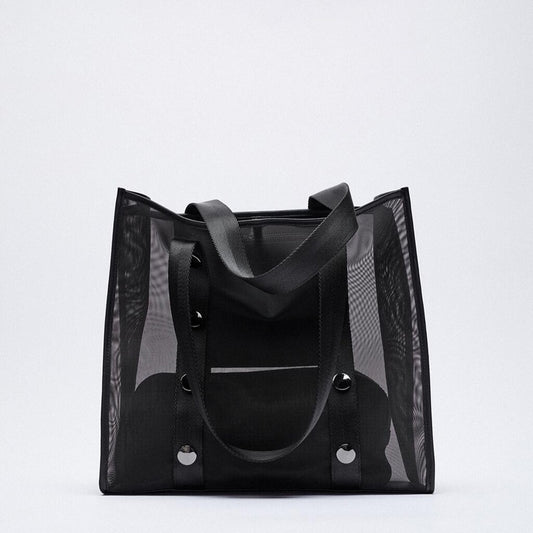 Designer Mesh Tote Women Handbag Fashion Rivet Black Shopper Bag Female Hollow Big Shoulder Bag Brands Composited Bags for Women 時尚鉚釘黑色大單肩網眼手提購物袋