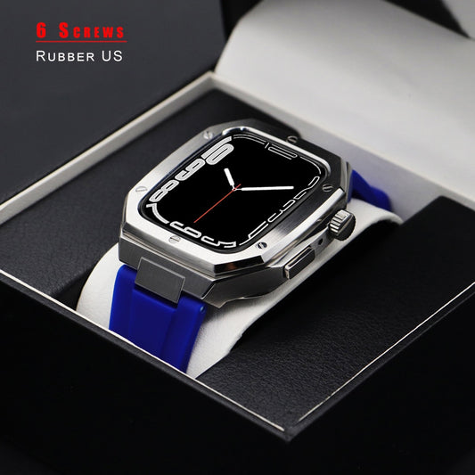 Luxury Case Strap For Apple Watch 44mm 45mm Stainless Steel Cover Rubber Band For iWatch Series 8 7 6 5 4 SE Modification Kit 豪華版不銹鋼錶殼連橡皮膠錶帶